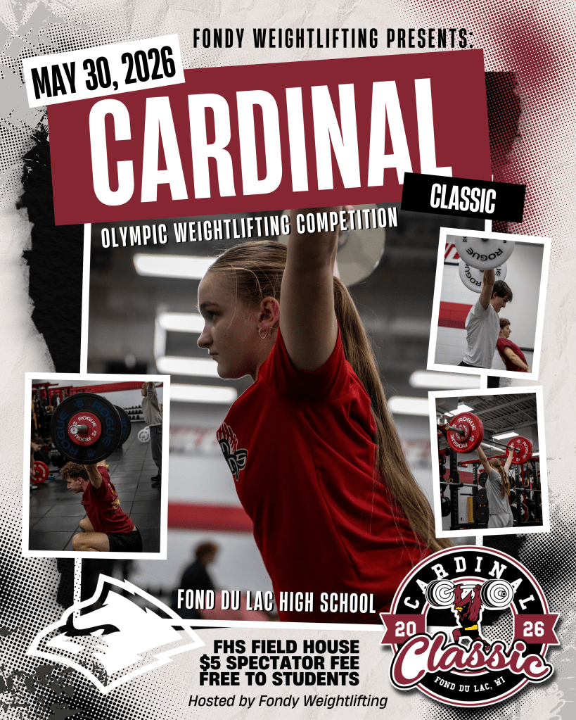 Fondy Weightlifting is proud to be hosting the Cardinal Classic on May 30, 2026 at Fond du Lac High School. Registration is LIVE and will close May 3, 2026. Use code FWLEARLY until Feb 20 to get 10% off your registration price!